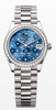 This Oyster Perpetual Datejust 31 in 18 kt white gold features an azzurro-blue floral-motif, diamond-set dial and a President bracelet.