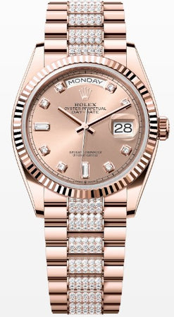 The Oyster Perpetual Day-Date 36 in 18 kt Everose gold with a rosé colour, diamond-set dial, fluted bezel and a diamond-set President bracelet.