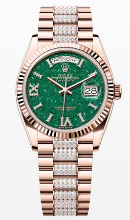 The Oyster Perpetual Day-Date 36 in 18 kt Everose gold with a green aventurine, diamond-set dial, fluted bezel and a diamond-set President bracelet.