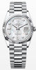 The Oyster Perpetual Day-Date 36 in platinum with a white mother-of-pearl, diamond-set dial, fluted bezel and a President bracelet.