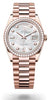 Day-Date 36 Oyster, 36 mm, Everose gold and diamonds. The Oyster Perpetual Day-Date 36 in 18 ct Everose gold, with a white mother-of-pearl, diamond-set dial, diamond-set bezel and a President bracelet. More Day-Date technical details Reference 128345RBR Model case...