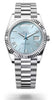 The Oyster Perpetual Day-Date 40 in platinum with an ice-blue dial, fluted bezel and a President bracelet.