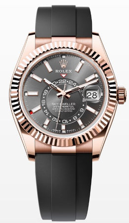 The Oyster Perpetual Sky-Dweller 42mm in 18 kt Everose gold with a slate dial and an Oysterflex bracelet.