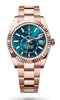 The Oyster Perpetual Sky-Dweller in 18 ct Everose gold with a blue-green dial and an Oyster bracelet.