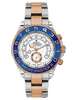44mm stainless steel case, 18K pink gold crown and push pieces, 18K pink gold 90 degree rotatable Command bezel with blue Cerachrom insert, white dial, automatic movement with programmable countdown function, stainless steel and 18K pink gold bracelet with Oysterlock safety clasp and 5 mm comfort extension link. Water resistant to 100 meters.