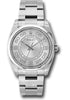 36mm brushed stainless steel case, domed bezel, silver dial, Arabic numerals, and brushed stainless steel Oyster bracelet.