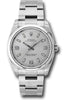 34mm stainless steel case, domed bezel, silver dial, Arabic numerals and index hour markers, self-winding perpetual mechanical movement, Oyster bracelet. Waterproof to 100 meters.