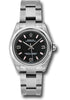 31mm brushed stainless steel case, domed bezel, black dial, pink index hour markers and Arabic numerals, and brushed stainless steel Oyster bracelet.