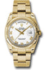 36mm 18K yellow gold case, fluted bezel, white dial, Roman numerals, and Oyster bracelet.