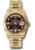 36mm 18K yellow gold case, screw-down back, screw-down crown with twinlock double waterproofness system, domed bezel, scratch-resistant sapphire crystal with cyclops lens over the date and double anti-reflective coating, bulls eye dial, 8 round and 2 baguette diamond hour markers, Rolex calibre 3155 automatic movement with rapid setting date and day, 18K yellow gold President bracelet with semi-circular three-piece links, concealed folding Crownclasp buckle. Waterproof to 100 meters.