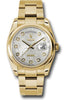 36mm 18K yellow gold case, domed bezel, silver jubilee dial, 8 round and 2 baguette diamond hour markers, and Oyster bracelet.
