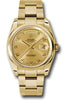 36mm 18K yellow gold case, domed bezel, champagne dial, Arabic numerals, and Oyster bracelet.