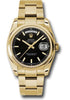 36mm 18K yellow gold case, domed bezel, black dial, index hour markers, and Oyster bracelet.