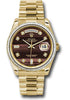 36mm 18K yellow gold case, bezel set with 60 baguette diamonds, bulls eye dial, 8 round and 2 baguette diamond hour markers, and President bracelet.