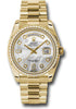 36mm 18K yellow gold case, bezel set with 52 diamonds, mother of pearl dial, 8 round and 2 baguette diamond hour markers, and President bracelet.