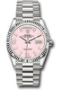 36mm 18K white gold case, screw-down back, screw-down crown with twinlock double waterproofness system, fluted bezel, scratch-resistant sapphire crystal with cyclops lens over the date, pink opal dial, diamond set index hour markes with Roman 6 and 9, Rolex calibre 3255 perpetual self-winding movement with centre hour, minute and seconds hands, instantaneous day and date in apertures, unrestricted rapid-setting, and stop-seconds for precise time setting, approximately 70 hours of power reserve, 18K white gold President bracelet with semi-circular three-piece links, concealed folding Crownclasp buckle. Waterproof to 100 meters. Baselworld 2019 release.