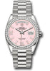 36mm 18K white gold case, screw-down back, screw-down crown with twinlock double waterproofness system, bezel set with 52 diamonds, scratch-resistant sapphire crystal with cyclops lens over the date, pink opal dial, diamond set index hour markes with Roman 6 and 9, Rolex calibre 3255 perpetual self-winding movement with centre hour, minute and seconds hands, instantaneous day and date in apertures, unrestricted rapid-setting, and stop-seconds for precise time setting, approximately 70 hours of power reserve, 18K white gold President bracelet with semi-circular three-piece links, concealed folding Crownclasp buckle. Waterproof to 100 meters. Baselworld 2019 release.