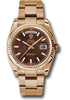 36mm 18K Everose gold case, screw-down back, screw-down crown with twinlock double waterproofness system, fluted bezel, scratch-resistant sapphire crystal with cyclops lens over the date and double anti-reflective coating, chocolate dial, index hour markers, Rolex calibre 3155 automatic movement with rapid setting date and day, 18K Everose gold Oyster bracelet with flat three-piece links, concealed folding Crownclasp buckle. Waterproof to 100 meters.
