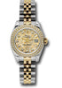 26mm stainless steel case, 18K yellow gold bezel set with 46 diamonds, yellow gold crystal dial with grey Jubilee pattern, diamond hour markers, and stainless steel and 18K yellow gold Jubilee bracelet.