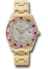 34mm 18K yellow gold case, screw-down crown, bezel set with 12 pink and 24 light-pink sapphire baguettes, scratch-resistant sapphire crystal with cyclops lens over the date, diamond paved dial, Roman numerals, Rolex calibre 2235 automatic movement, 18K yellow gold Pearlmaster bracelet with rounded five-piece links, concealed folding Crownclasp buckle. Water resistant to 100 meters.