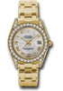 34mm 18K yellow gold case, end pieces set with 28 diamonds, screw-down crown, bezel set with 34 diamonds, scratch-resistant sapphire crystal with cyclops lens over the date, white mother-of-pearl dial, Roman numerals, Rolex calibre 2235 automatic movement, 18K yellow gold Pearlmaster bracelet with rounded five-piece links, concealed folding Crownclasp buckle. Water resistant to 100 meters.