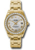34mm 18K yellow gold case, screw-down crown, bezel set with 34 diamonds, scratch-resistant sapphire crystal with cyclops lens over the date, white mother-of-pearl dial, Roman numerals, Rolex calibre 2235 automatic movement, 18K yellow gold Pearlmaster bracelet with rounded five-piece links, concealed folding Crownclasp buckle. Water resistant to 100 meters.