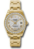 34mm 18K yellow gold case, screw-down crown, bezel set with 34 diamonds, scratch-resistant sapphire crystal with cyclops lens over the date, white mother-of-pearl dial, Roman numerals with 11 diamonds set on VI , Rolex calibre 2235 automatic movement, 18K yellow gold Pearlmaster bracelet with rounded five-piece links, concealed folding Crownclasp buckle. Water resistant to 100 meters.