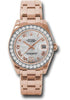 34mm 18K Everose gold case, screw-down crown, bezel set with 32 diamonds, scratch-resistant sapphire crystal with cyclops lens over the date, white mother-of-pearl dial, Roman numerals with 11 diamonds set on VI , Rolex calibre 2235 automatic movement, 18K Everose gold Pearlmaster bracelet with rounded five-piece links, concealed folding Crownclasp buckle. Water resistant to 100 meters.