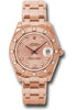 34mm 18K pink gold case, polished bezel set with 12 diamonds, pink dial, diamond hour markers, and Oyster 17mm bracelet.