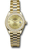 28mm 18K yellow gold oyster case, screw-down crown with twinlock double waterproofness system, bezel set with 44 diamonds, scratch-resistant sapphire crystal with cyclops lens over the date and double anti-reflective coating, champagne dial, Roman numerals, Rolex calibre 2236 automatic movement with center hour, minute and seconds hands, instantaneous date with rapid setting, and stop-seconds for precise time setting, 18K yellow gold President bracelet with semi-circular three-piece links, concealed folding Crownclasp buckle. Waterproof to 100 meters.