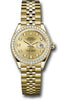 28mm 18K yellow gold oyster case, screw-down crown with twinlock double waterproofness system, bezel set with 44 diamonds, scratch-resistant sapphire crystal with cyclops lens over the date and double anti-reflective coating, champagne dial, 10 diamond hour markers, Rolex calibre 2236 automatic movement with center hour, minute and seconds hands, instantaneous date with rapid setting, and stop-seconds for precise time setting, 18K yellow gold Jubilee bracelet with five-piece links, concealed folding Crownclasp buckle. Waterproof to 100 meters.