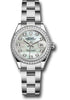28mm white Rolesor case comprised of a 904L steel monobloc middle case, screw-down steel back, screw-down crown with twinlock double waterproofness system, 18K white gold fluted bezel set with 44 diamonds, scratch-resistant sapphire crystal with cyclops lens over the date and double anti-reflective coating, white mother-of-pearl dial, 10 diamond hour markers, Rolex calibre 2236 automatic movement with center hour, minute and seconds hands, instantaneous date with rapid setting, and stop-seconds for precise time setting, stainless steel Oyster bracelet with flat three-piece links, folding Oysterclasp buckle with Easylink 5mm comfort extension link. Waterproof to 100 meters.