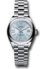 28mm platinum case, screw-down crown with twinlock double waterproofness system, domed bezel, scratch-resistant sapphire crystal with cyclops lens over the date and double anti-reflective coating, ice blue dial, 36 diamonds set in index hour markers and 8 diamond set in Roman numeral IX, Rolex calibre 2236 automatic movement with center hour, minute and seconds hands, instantaneous date with rapid setting, and stop-seconds for precise time setting, platinum President bracelet with semi-circular three-piece links, concealed folding Crownclasp buckle. Waterproof to 100 meters.