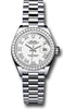 28mm platinum case, screw-down crown with twinlock double waterproofness system, bezel set with 44 diamonds, scratch-resistant sapphire crystal with cyclops lens over the date, white dial, Roman numerals, Rolex calibre 2236 automatic movement with center hour, minute and seconds hands, instantaneous date with rapid setting, and stop-seconds for precise time setting, approximately 55 hours of power reserve, platinum President bracelet with semi-circular three-piece links, concealed folding Crownclasp buckle. Waterproof to 100 meters.