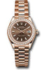 28mm 18K Everose gold oyster case, screw-down crown with twinlock double waterproofness system, bezel set with 44 diamonds, scratch-resistant sapphire crystal with cyclops lens over the date and double anti-reflective coating, chocolate dial, index hour markers with Chromalight, Rolex calibre 2236 automatic movement with center hour, minute and seconds hands, instantaneous date with rapid setting, and stop-seconds for precise time setting, 18K Everose gold President bracelet with semi-circular three-piece links, concealed folding Crownclasp buckle. Waterproof to 100 meters.