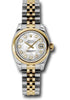 26mm stainless steel case, 18K yellow gold domed bezel, mother of pearl dial, diamond hour markers, and stainless steel and 18K yellow gold Jubilee bracelet.