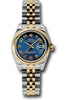 26mm stainless steel case, 18K yellow gold domed bezel, blue concentric circle dial, Arabic numerals, and stainless steel and 18K yellow gold Jubilee bracelet.