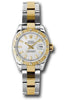 26mm stainless steel case, 18K yellow gold fluted bezel set with 12 diamonds, silver dial, stick hour markers, and stainless steel and 18K yellow gold Oyster bracelet.