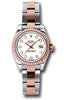 26mm stainless steel case, 18K pink gold fluted bezel, white dial, diamond hour markers, and stainless steel and 18K pink gold Oyster bracelet.