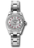 26mm stainless steel case, 18K white gold fluted bezel, mother of pearl dial, ruby hour markers, and stainless steel Oyster bracelet.