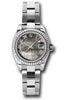 26mm stainless steel case, 18K white gold fluted bezel, dark mother of pearl dial, Roman numerals, and stainless steel Oyster bracelet.