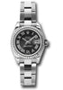 26mm stainless steel case, 18K white gold fluted bezel, black sunbeam dial, Roman numerals, and stainless steel Oyster bracelet.