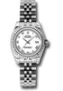 26mm stainless steel case, 18K white gold fluted bezel, white dial, Roman numerals, and stainless steel Jubilee bracelet.