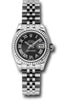 26mm stainless steel case, 18K white gold fluted bezel, black sunbeam dial, Roman numerals, and stainless steel Jubilee bracelet.