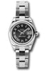 26mm stainless steel case, domed bezel, black sunbeam dial, Roman numerals, and Oyster bracelet.