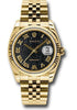 36mm 18K yellow gold case, fluted bezel, black jubilee dial, Roman numerals, and 18K yellow gold Jubilee bracelet.