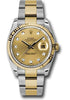 36mm stainless steel case, 18K yellow gold fluted bezel, champagne dial, diamond hour markers, and stainless steel and 18K yellow gold Oyster bracelet.