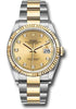 36mm yellow Rolesor case with Oystersteel monobloc middle case, screw-down steel back, screw-down 18K yellow crown, 18K yellow fluted bezel, champagne dial, 10 diamond hour markers, Rolex calibre 3235 self-winding movement with date at 3 o'clock, approximately 70 hours of power reserve, yellow Rolesor Oyster bracelet with flat three-piece links, folding Oysterclasp buckle with Easylink 5mm comfort extension link. Waterproof to 100 meters. Redesigned for Baselworld 2018 with updated case sides, lugs, and calibre 3235 movement.