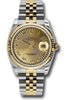 36mm stainless steel case, 18K yellow gold fluted bezel, champagne sunbeam dial, Roman numerals, and stainless steel and 18K yellow gold Jubilee bracelet.