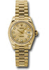 26mm 18K yellow gold case, fluted bezel, champagne jubilee dial, diamond hour markers, and President bracelet.